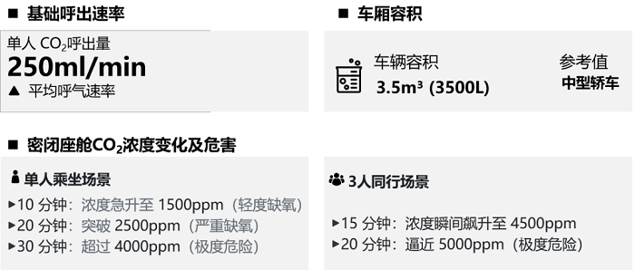 汽车座舱空间有限,人体呼吸会持续消耗O2、呼出CO2。在车窗紧闭、内循环开启的密闭座舱环境,新鲜空气无法及时补充,导致CO2浓度短时间内快速攀升,超过安全阈值,不仅影响司乘人员的健康,严重还会引发疲劳驾驶引发交通事故。更多内容详见《车内缺氧隐患:被忽视的二氧化碳浓度监测》